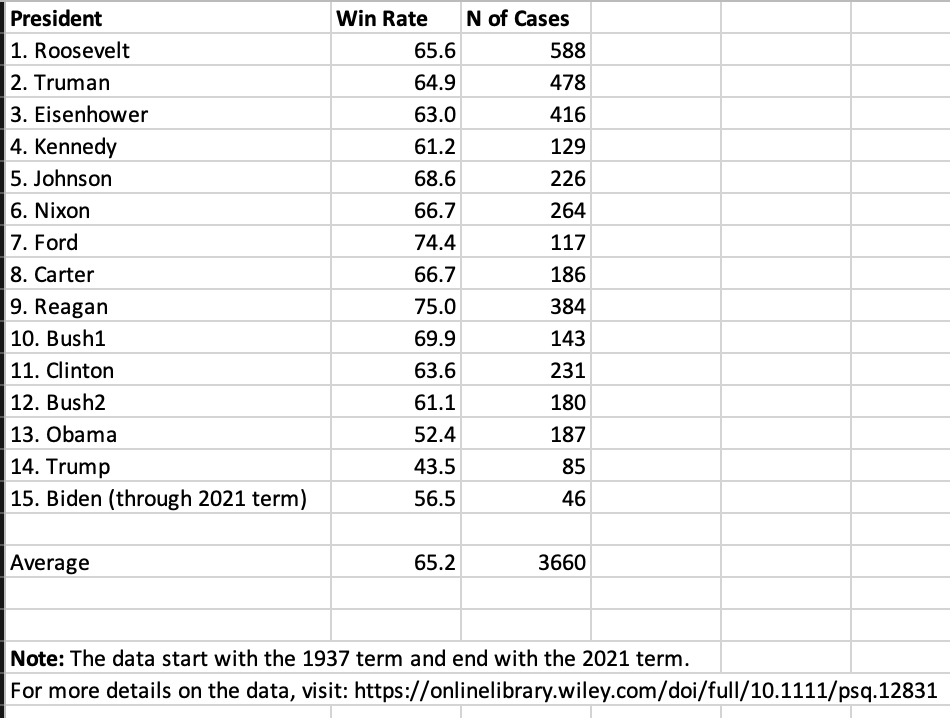 Figure 3 in the paper shows the president’s win rate by Chief Justice era. The chart below shows the win rate by president.